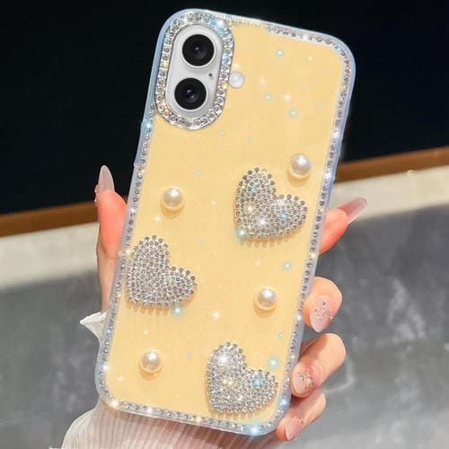 Funda para iPhone 17 con diseño de corazón de perla y purpurina de diamante, a prueba de golpes en cuatro esquinas (amarillo claro)