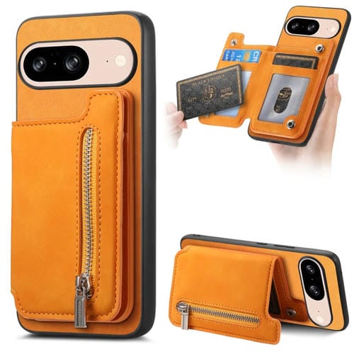 Funda para Teléfono con Cremallera Magsafe Retro para Google Pixel 8 con Funda para Tarjeta (Amarilla)