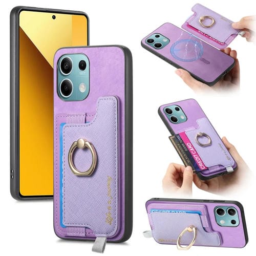 Funda para Teléfono con TaRJetero y Anillo de Cuero con Diseño Retro Magsafe para Xiaomi Redmi Note 13 5G (Morado)