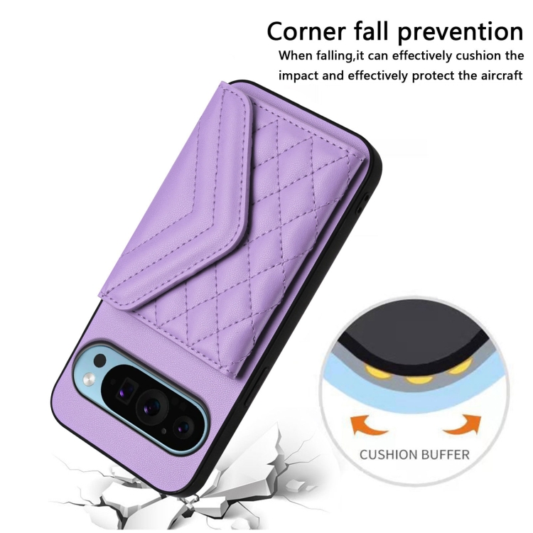 Funda para Teléfono Google Pixel 9 Pro XL con Textura Rómbica, Tarjetero RFID y Cordón Largo (Morado Claro)