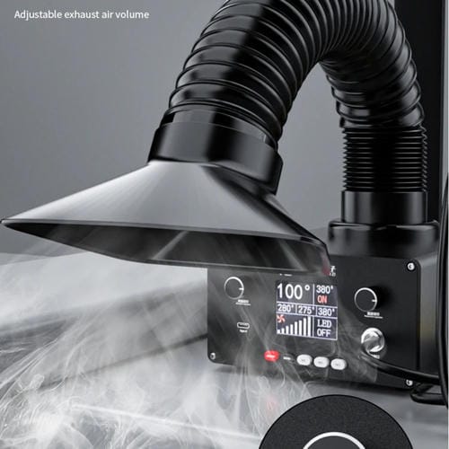 - Potencia total de 150W, potencia del cabezal de soldador 72W, longitud de línea del mango 1,2 m, pipa de absorción de humo de 56 cm con ajuste de 360 grados, iluminación LED de tres orificios para mejor visibilidad