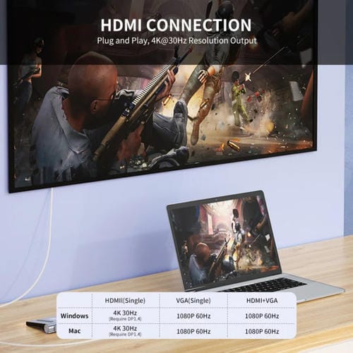 - Puertos: 1x Lector Micro SD, 1x Lector TF, 1x USB 3.0, 2x USB 2.0, 1x Puerto Carga PD Tipo C (hasta 87 W), 1x USB-C transferencia, 1x HDMI 4K, 1x VGA, 1x audio 3.5 mm, 1x Ethernet RJ45 100 Mbps