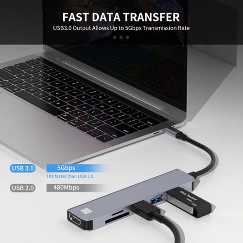 El Adaptador Junsunmay 6 en 1 Tipo-C a 4K es una estación de acoplamiento multifuncional diseñada para ampliar la conectividad de dispositivos con Puerto USB-C. Compatible con una amplia gama de ordenadores Portátiles, tablets y smartphones que disponen de Conexión USB-C, este hub permite la Conexión simultánea de múltiples periféricos y la transferencia de datos eficiente. Su función principal es ofrecer una salida de video HDMI 4K para transmitir contenido en alta definición a monitores, televisores o proyectores, además de incorporar Lectores de Tarjetas SD y TF, Puertos USB 3.0 y USB 2.0 para conectar dispositivos externos como Discos duros, Teclados o ratones.