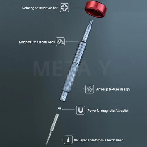 El Destornillador Magnético Mechanic Meta y Cross 1.5 es una herramienta profesional diseñada para la reparación de Teléfonos Móviles. Fabricado con aleación de aluminio de aviación, este destornillador ofrece una broca tridimensional extra dura con fuerte adsorción magnética que facilita el manejo de tornillos pequeños y delicados. Su diseño liviano y Portátil, junto con un mango antideslizante, proporciona un agarre cómodo y seguro durante las tareas de desmontaje y montaje. Compatible con una amplia variedad de modelos de Teléfonos, este destornillador es ideal para técnicos y usuarios que reparan por cuenta propia, asegurando precisión y eficiencia en cada intervención.
