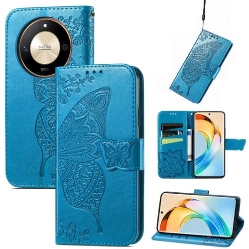 Funda para Honor X50 de Cuero con Relieve de Flor de Amor y Mariposa (Azul)