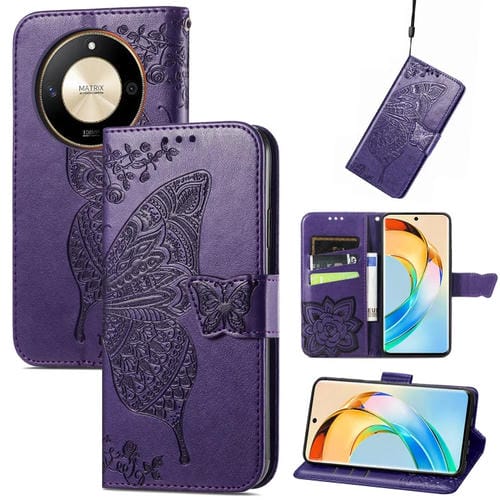 Funda para Honor X50 de Cuero con Relieve Flor de Amor y Mariposa (Púrpura Oscuro)