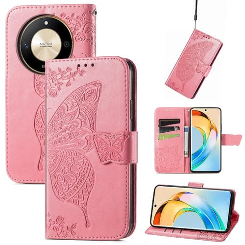 Funda para Honor X50 de Cuero con Relieve Flor de Amor y Mariposa (Rosa)