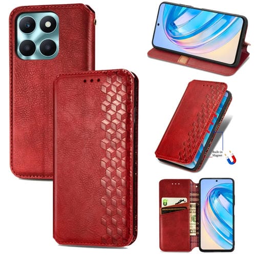 Funda para Honor X6A Cubic Grid Cuero Magnético Prensado (Rojo)
