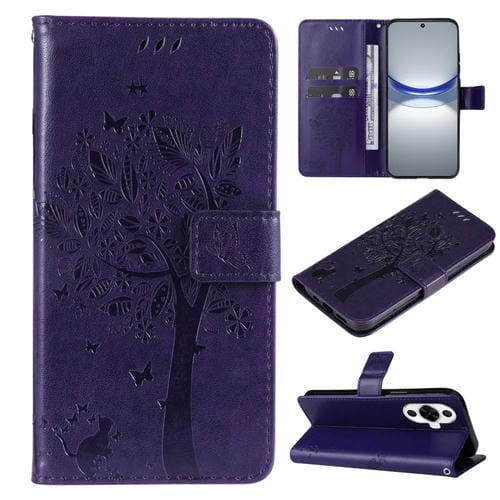 - 1x Funda para Huawei Nova 12S de Cuero con Tapa y Patrón en Relieve Árbol y Gato (Púrpura)