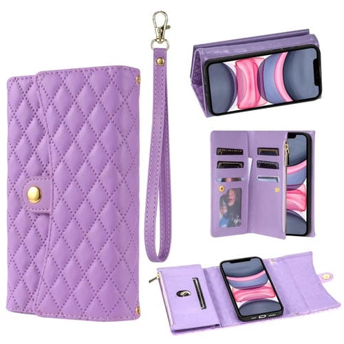 Funda para Teléfono iPhone 11 Cuero Rómbico con Billetera MultiTarjeta y Cremallera (Púrpura)