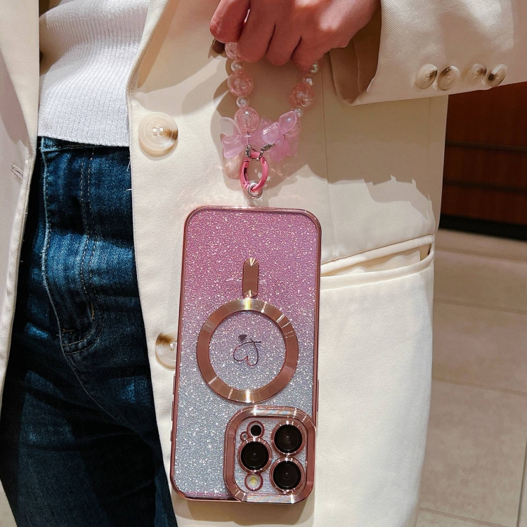 Funda para Teléfono iPhone 12 Loves Gradient Glitter Pulseras Magsafe TPU Fibra de Carbono (Rosa)