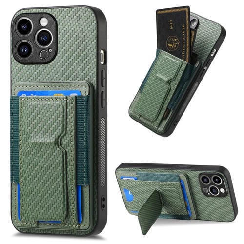 Funda para Teléfono iPhone 12 Pro con Bolsa para Tarjeta Elástica Soporte Plegable Fibra de Carbono (Verde)