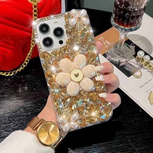 Funda para teléfono iPhone 12 Pro con soporte girasol y PC con diamantes colocados a mano (Dorado)