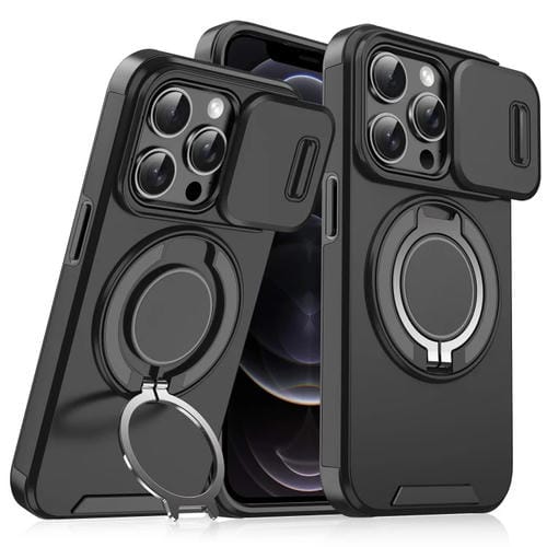 For iPhone 12 Pro Phone Case with Slide Cam Ring Holder (Black)