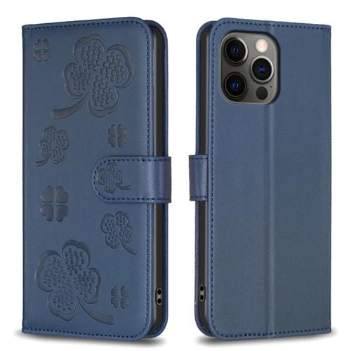 For iPhone 12 Pro Max Four-leaf Embossed Leather Phone Case (Blue)