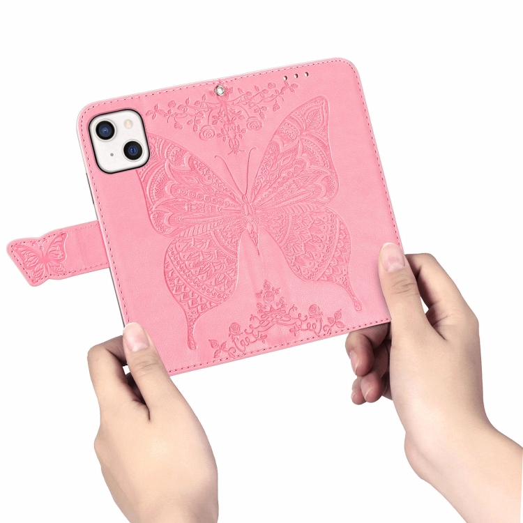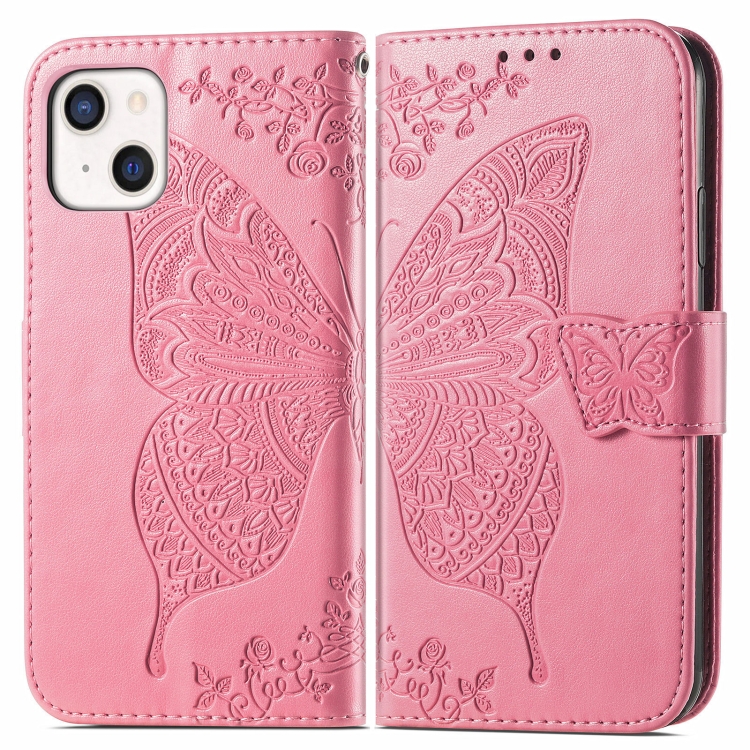 Estuche de Cuero para iPhone 13 Mini Butterfly Love Flower con Tapa Horizontal En Relieve Soporte Ranura para Tarjeta Billetera Cordón (Rosa)