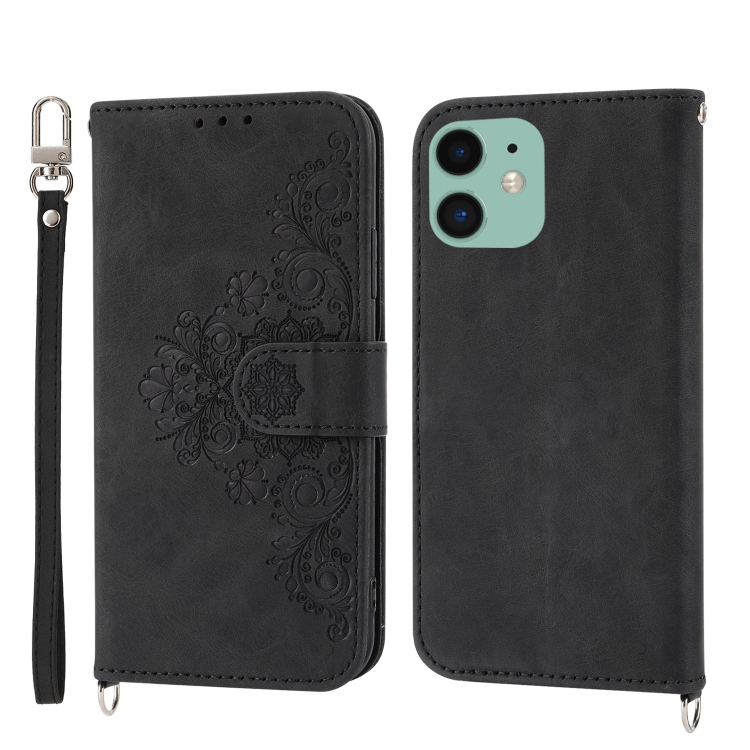 Funda de Cuero Skin-Feel Flowers para iPhone 13 Mini con Billetera en Relieve (Negro)