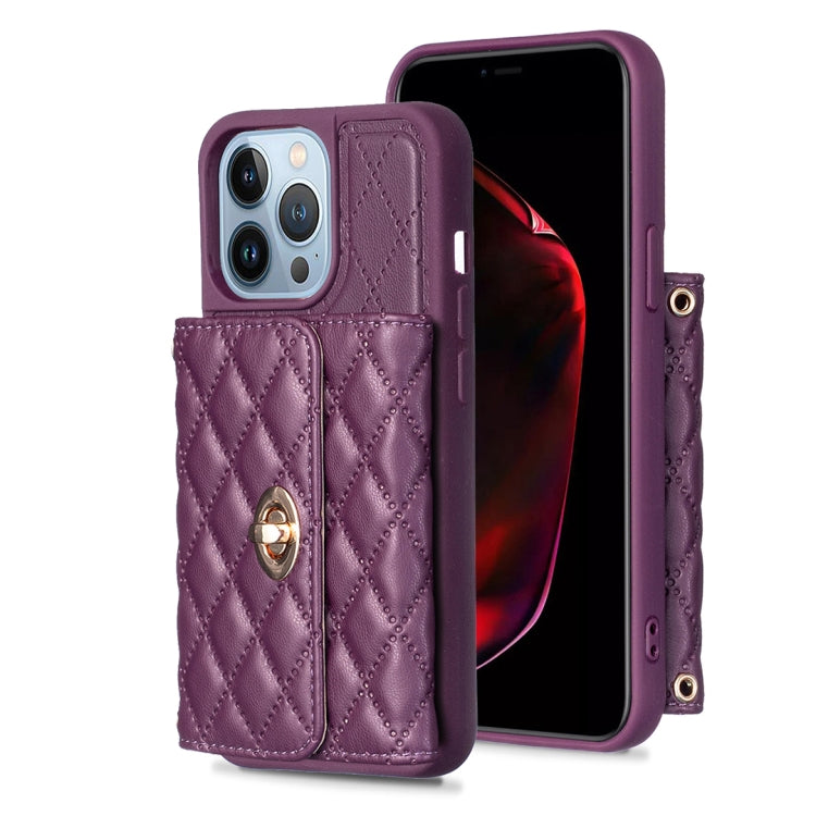 Caja de Teléfono Cuero Rómbica para iPhone 13 Pro con Hebilla de Metal Horizontal (Púrpura Oscuro)