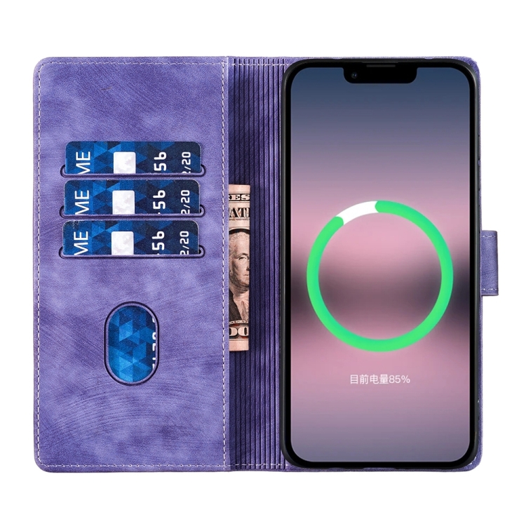 Funda de Cuero para iPhone 13 Pro Max Pen Heart Cat En Relieve (Púrpura)