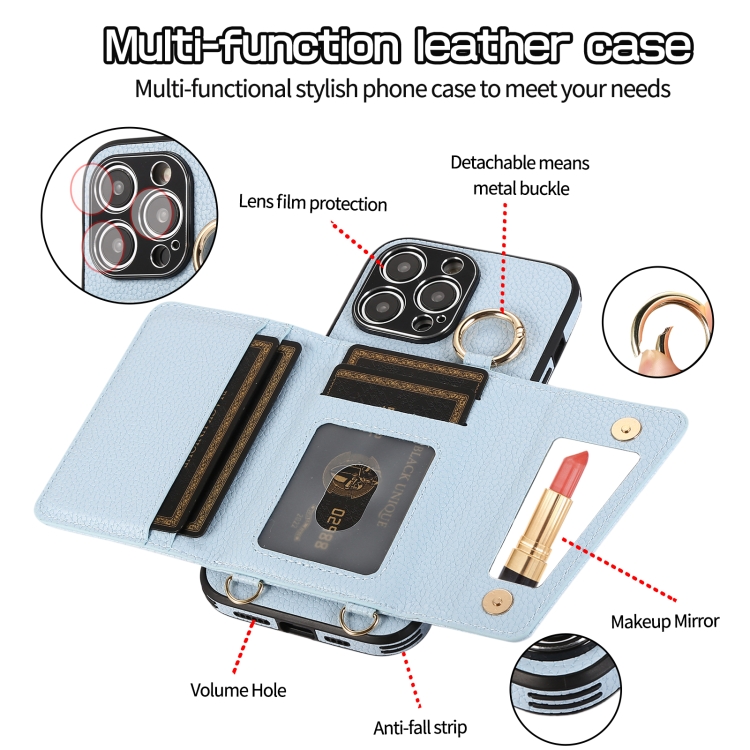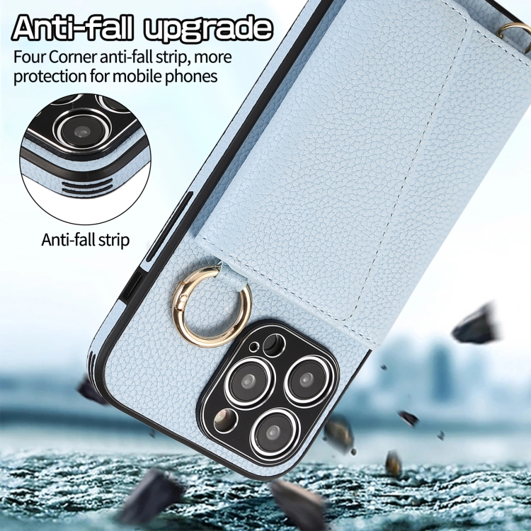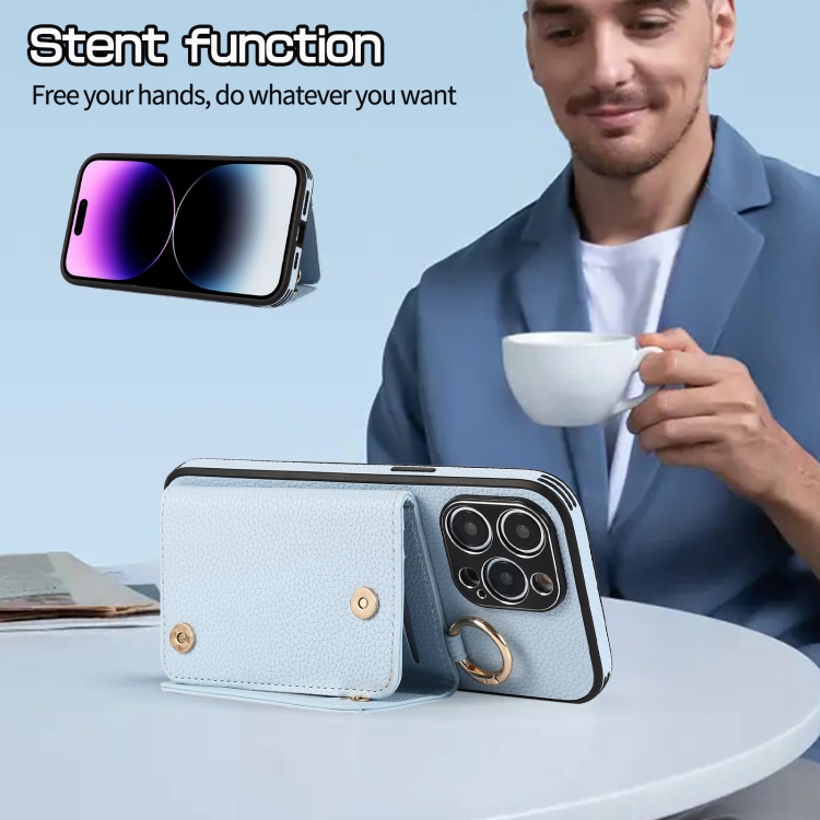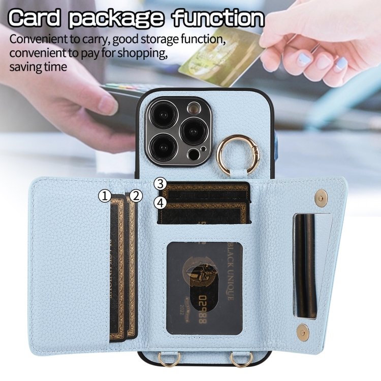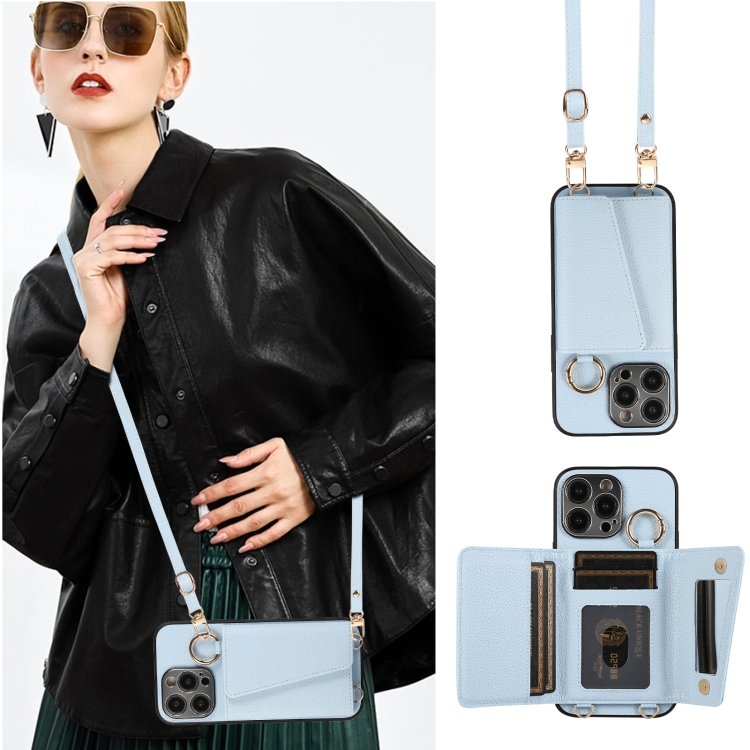Funda para Teléfono iPhone 14 Contraportada de Cuero Billetera y Anillo Cruzado (Azul)