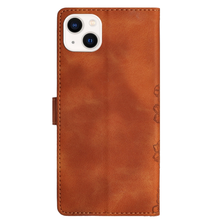 Funda para Teléfono iPhone 14 PU Piel Mariposa y Flor de Cerezo En Relieve (Marrón)