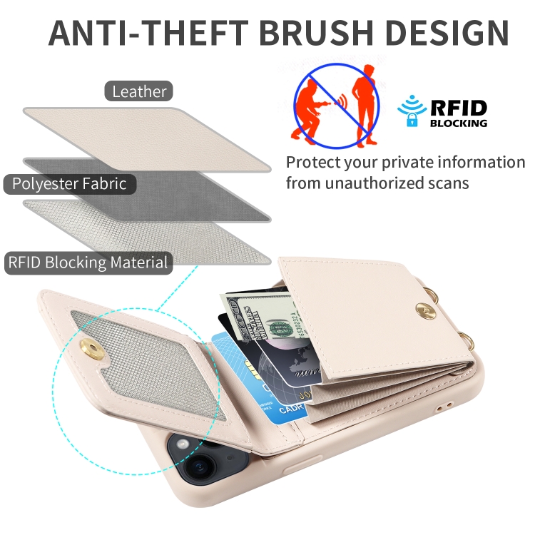Funda de Cuero para iPhone 15 con Billetera, Cremallera y Cordón Cruzado (Beige)