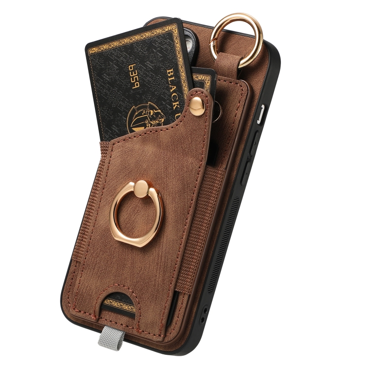 Funda para Teléfono iPhone 15 con Bolsa para Tarjeta y Anillo Sensación de Piel Retro con Lazo para Colgar (Marrón)