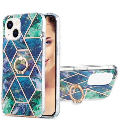 Estuche TPU para iPhone 15 Galvanoplastia Empalme Patrón Mármol con Soporte para Anillo (Azul Verde)