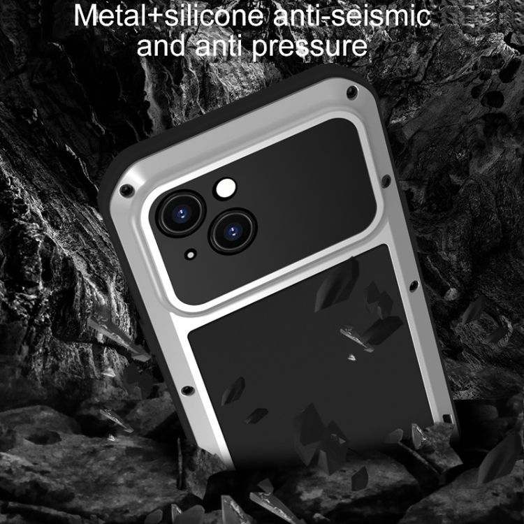 Caja de teléfono Love Mei para iPhone 15 a prueba de polvo impermeable y a prueba de golpes de metal (Plateada)