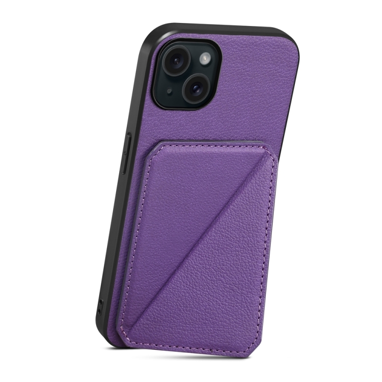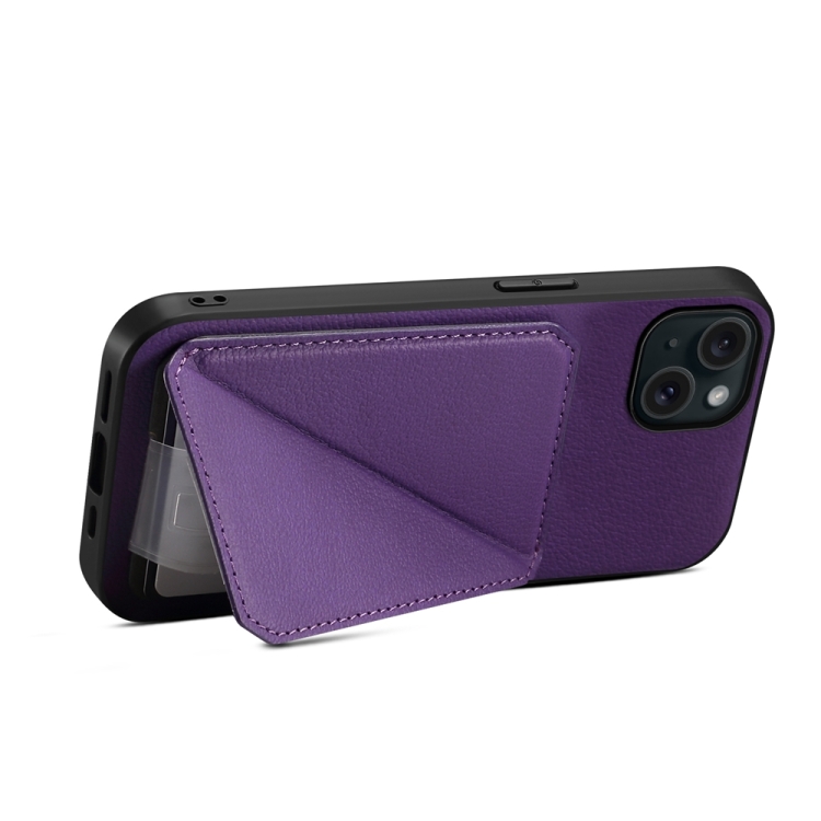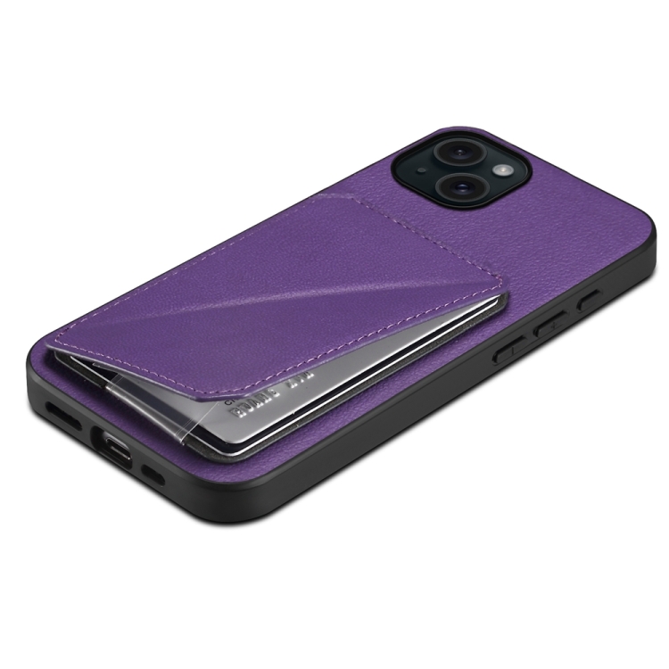 Funda para Teléfono iPhone 15 Plus D04 con Ranura para Tarjeta Dual Textura de Becerro (Púrpura)