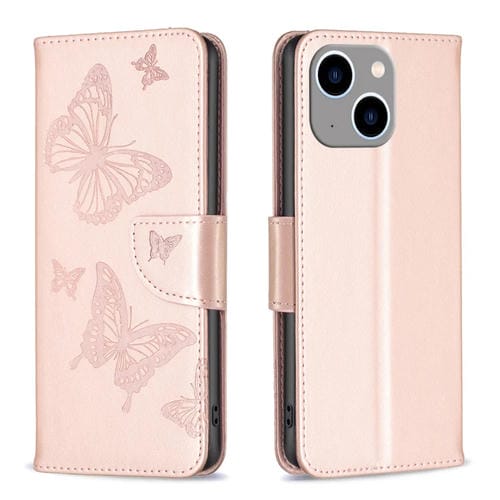 For iPhone 15 Plus Embossed Pattern Two Butterflies Leather Phone Case (Rose Gold)
