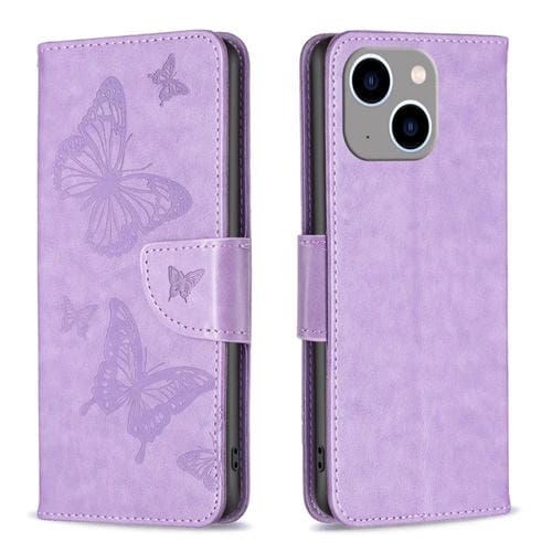 Funda para iPhone 15 Plus Cuero Estampado en Relieve Dos Mariposas (Púrpura)