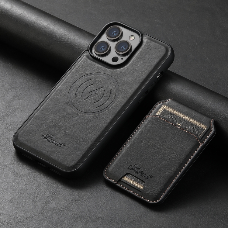 Funda Trasera para iPhone 15 Plus Suteni H15 Magsafe Oil Eax con Billetera Desmontable de Cuero (Negro)