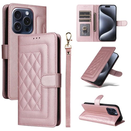 Estuche para Teléfono iPhone 15 Pro con Tapa de Cuero y Entramado de Diamantes (Oro Rosa)