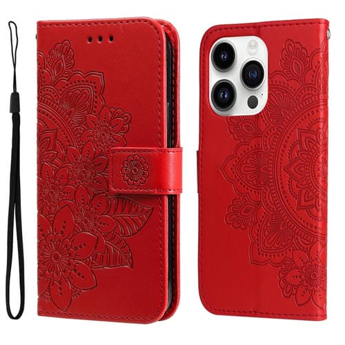 Estuche para Teléfono iPhone 15 Pro Cuero Estampado Flores 7 Pétalos (Rojo)