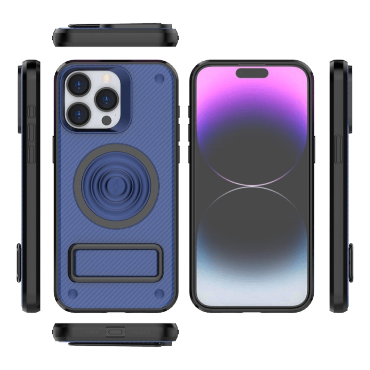 For iPhone 15 Pro Max Phone Case PC+TPU Carbon Fiber Texture with Metal Kickstand(Blue)