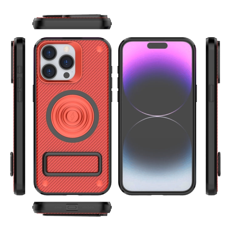 For iPhone 15 Pro Max Phone Case PC+TPU Carbon Fiber Texture with Metal Kickstand(Red)