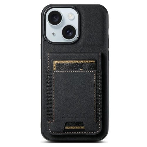Funda para teléfono Suteni H03 para iPhone 15 con soporte para tarjeta de cuero litchi (Negro)