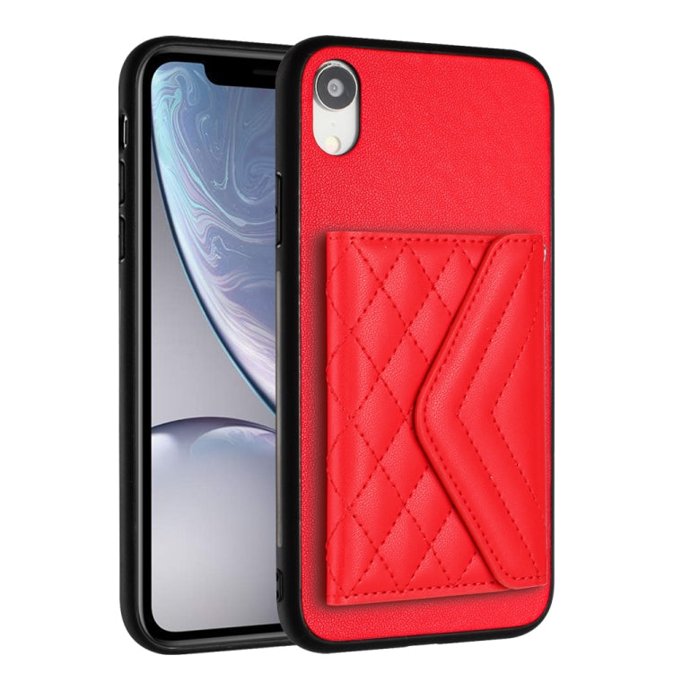 Estuche para Teléfono iPhone Xr con Bolsa para Tarjetas Rfid Textura Rómbica Cordón Largo (Rojo)
