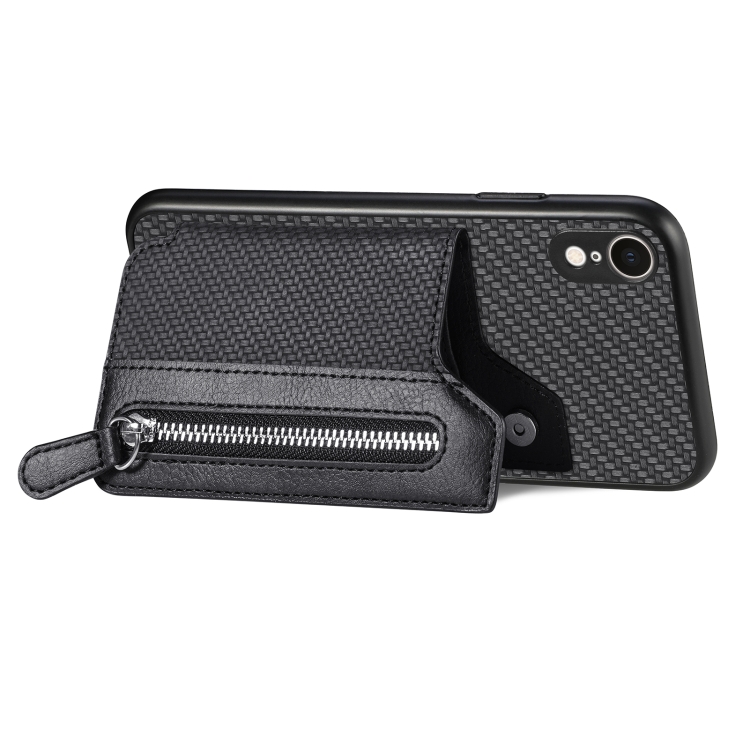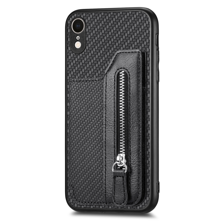 Funda de teléfono para iPhone Xr con cremallera y tapa horizontal de fibra de carbono (Negro)