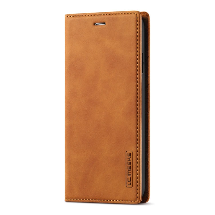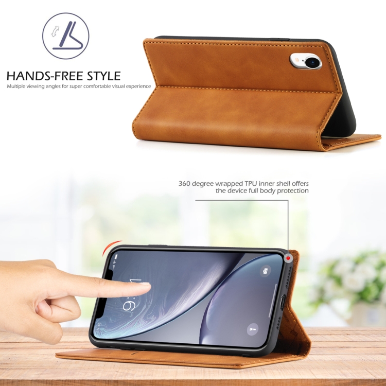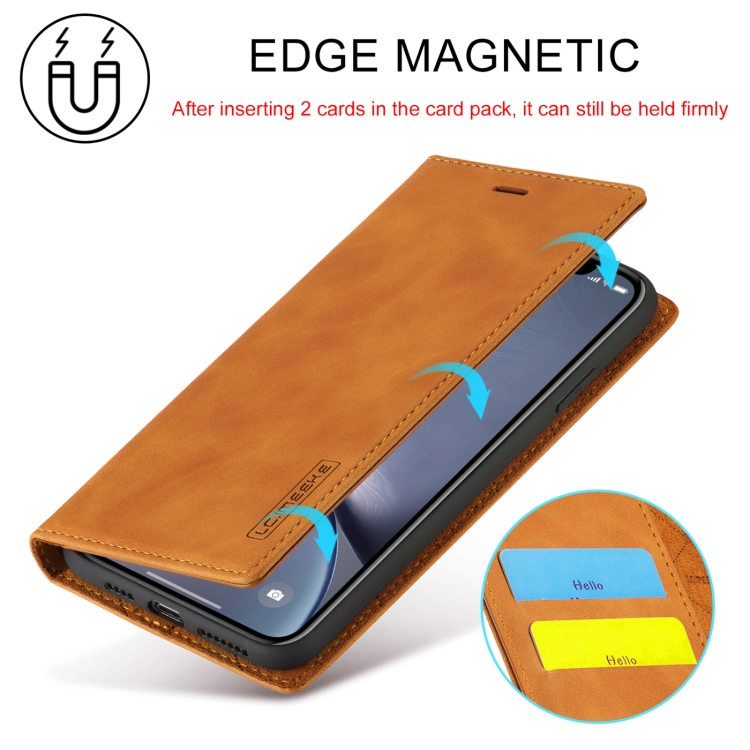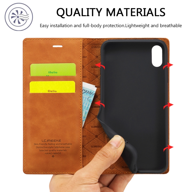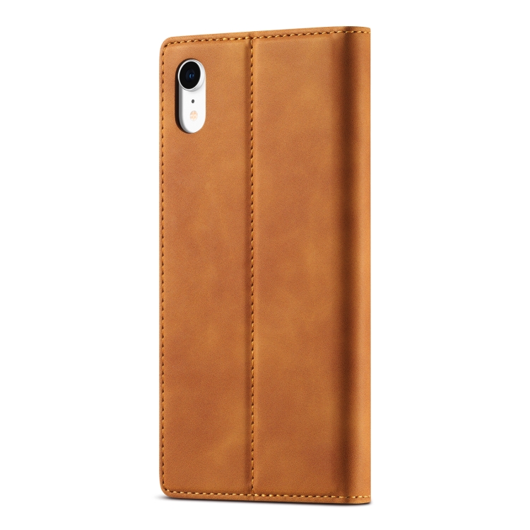 Funda para iPhone Xr Lc.Imeeke Flip Horizontal Ultrafino Magnetismo Fuerte TPU + PU Cuero Soporte Ranuras Tarjetas Billetera (Marrón)