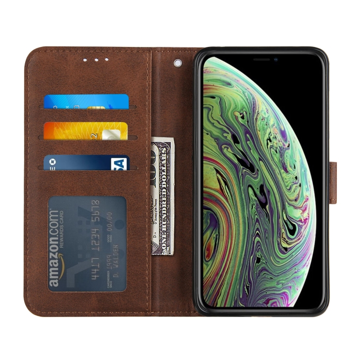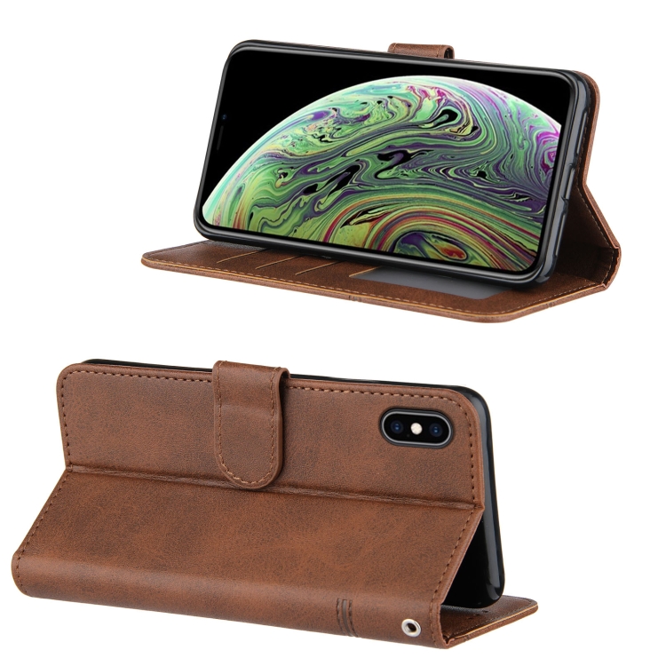 Funda de cuero iPhone Xs Max costura textura pantorrilla hebilla tapa horizontal soporte ranuras tarjetas billetera cordón (Marrón)