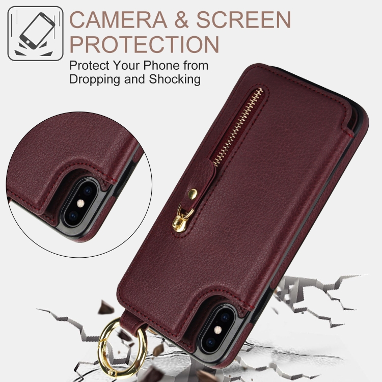 Funda para Teléfono iPhone Xs / X con Bolsa para Tarjetas Doble Hebilla Cremallera (Rojo Granate)