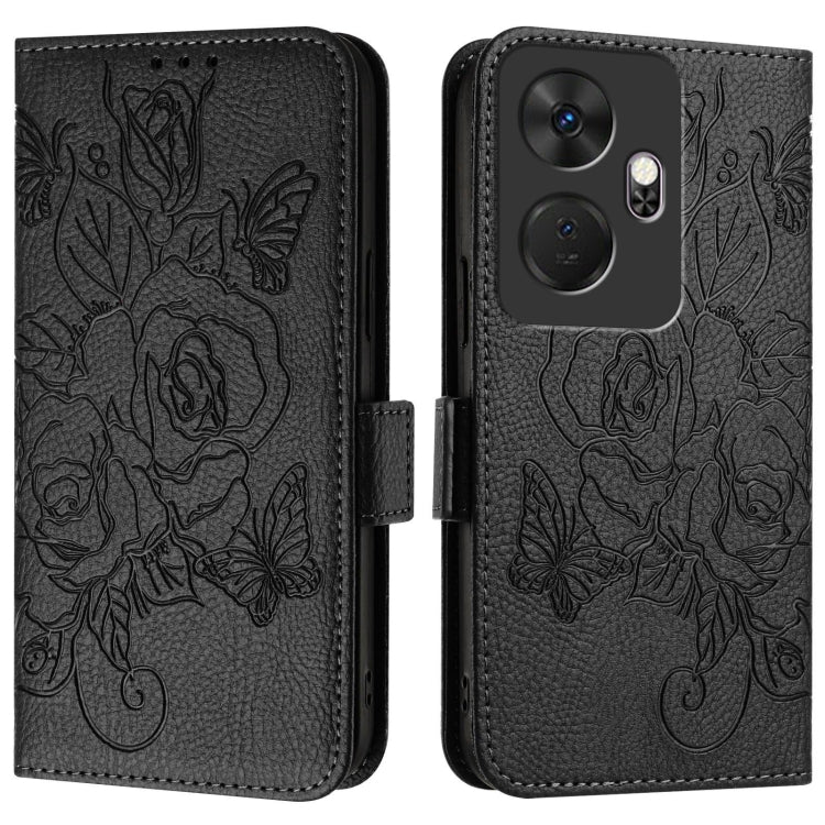 Estuche de Cuero Antirrobo RFID para Itel P55 con Rosa en Relieve (Negro)