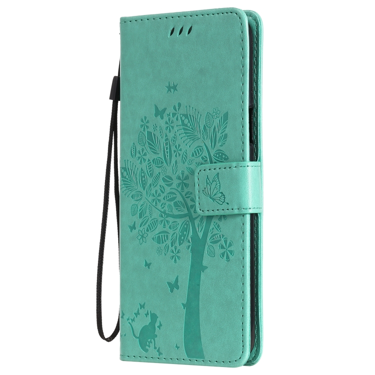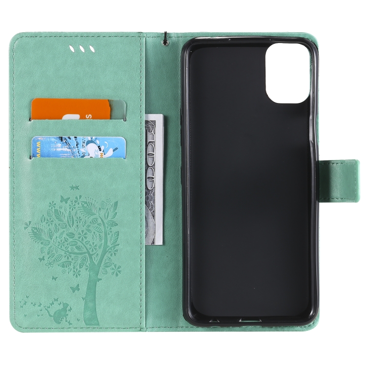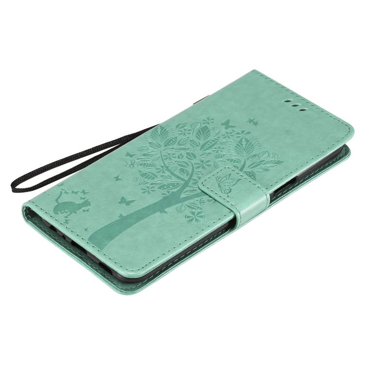 Funda de Cuero PU para LG K42 con Impresión Tree & CAT, Titular, Tragamonedas y Cordón (Verde)