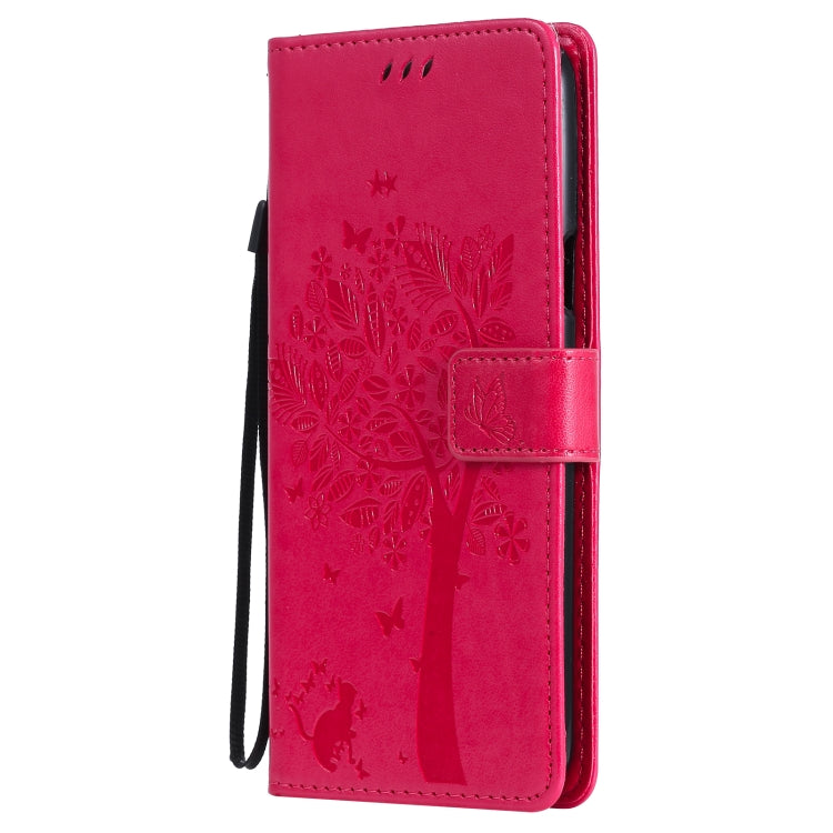 Funda de Cuero PU para LG K42 con Patrón Tree & CAT, Titular, Billetera y Cordón (Rose Rojo)