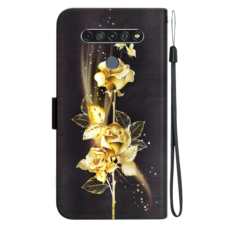 Estuche de Cuero para LG K61 con Dibujo Coloreado y Textura de Cristal (Mariposa Dorada Rosa)