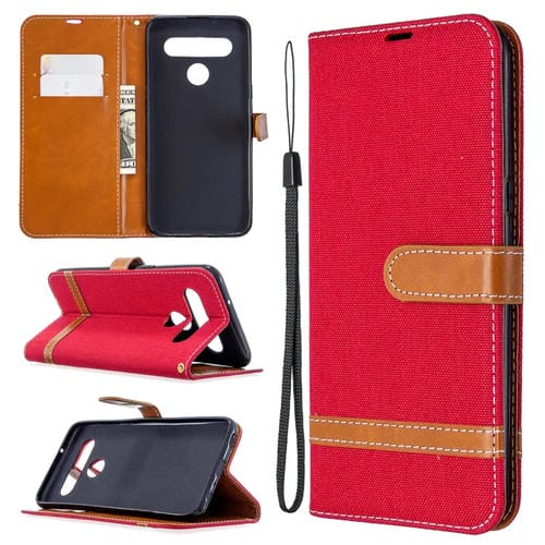Funda de Cuero para LG K61 con Tapa Horizontal, Textura Mezclilla, Soporte, Ranuras y Cordón (Rojo)