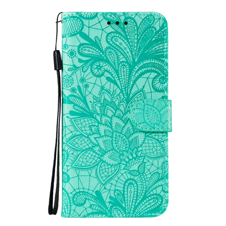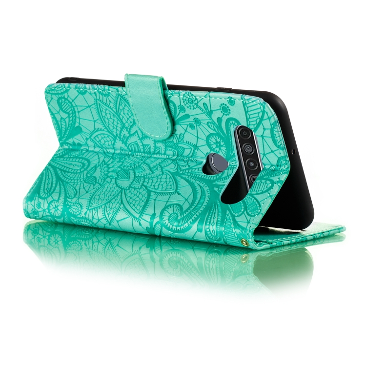 Funda de Cuero para LG K61 Lace Flower con Tapa Horizontal, Soporte, Ranuras para Tarjetas y Marco de Fotos (Verde)