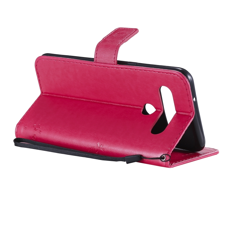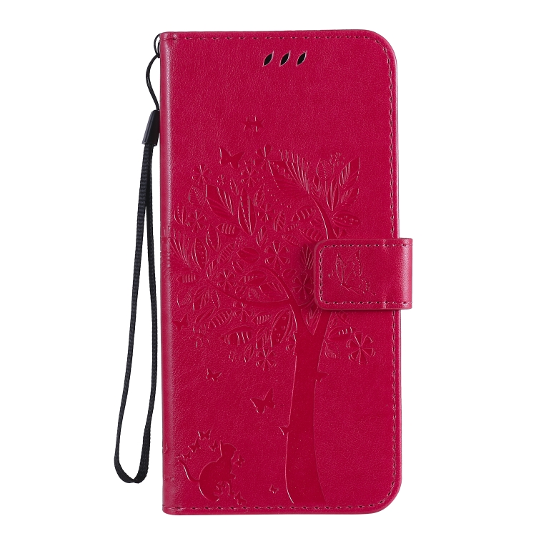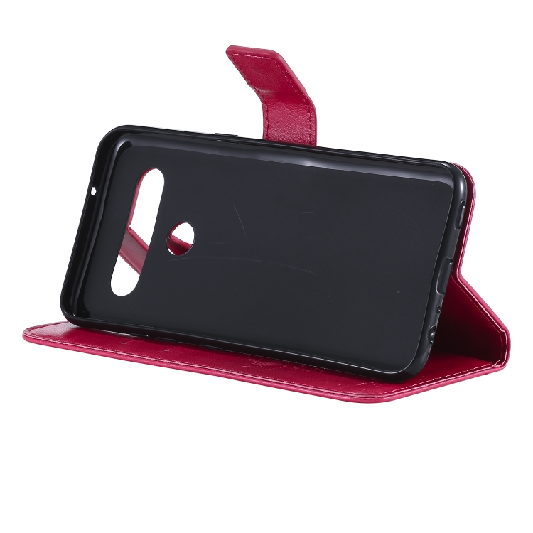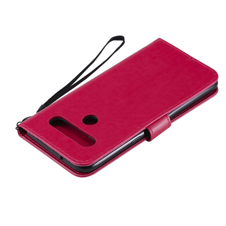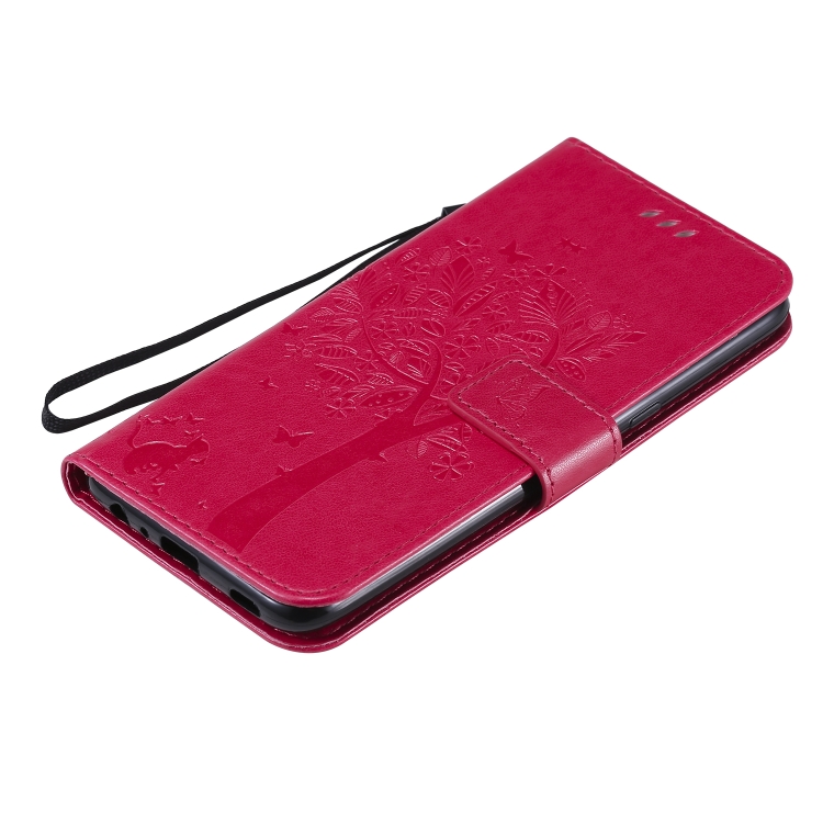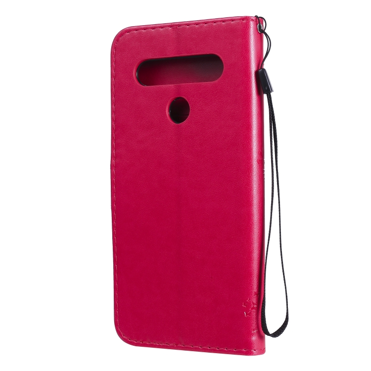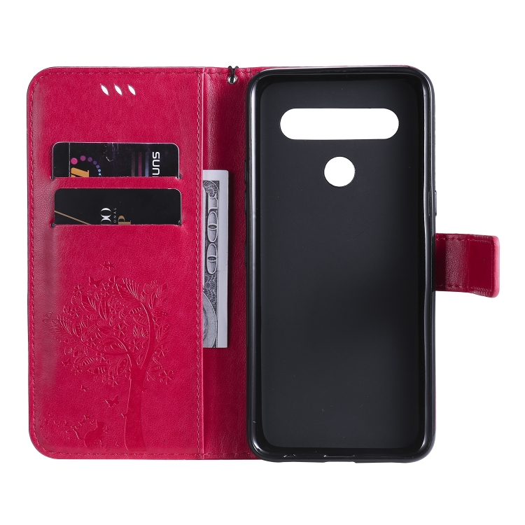 Funda de Cuero para LG K61 Tree & CAT con Tapa Horizontal, Soporte, Ranuras para Tarjetas, Billetera y Cordón (Rosa Roja)